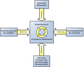 Eines markts und damit indirekt auch die rentabilität für die in dem markt tätigen unternehmen. . Dabei werden zur ermittlung von wettbewerbsorientierten strategien alle kräfte (=forces), die in einer oder auf eine branche einwirken, definiert und deren auswirkungen auf den markt beurteilt.